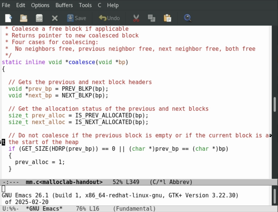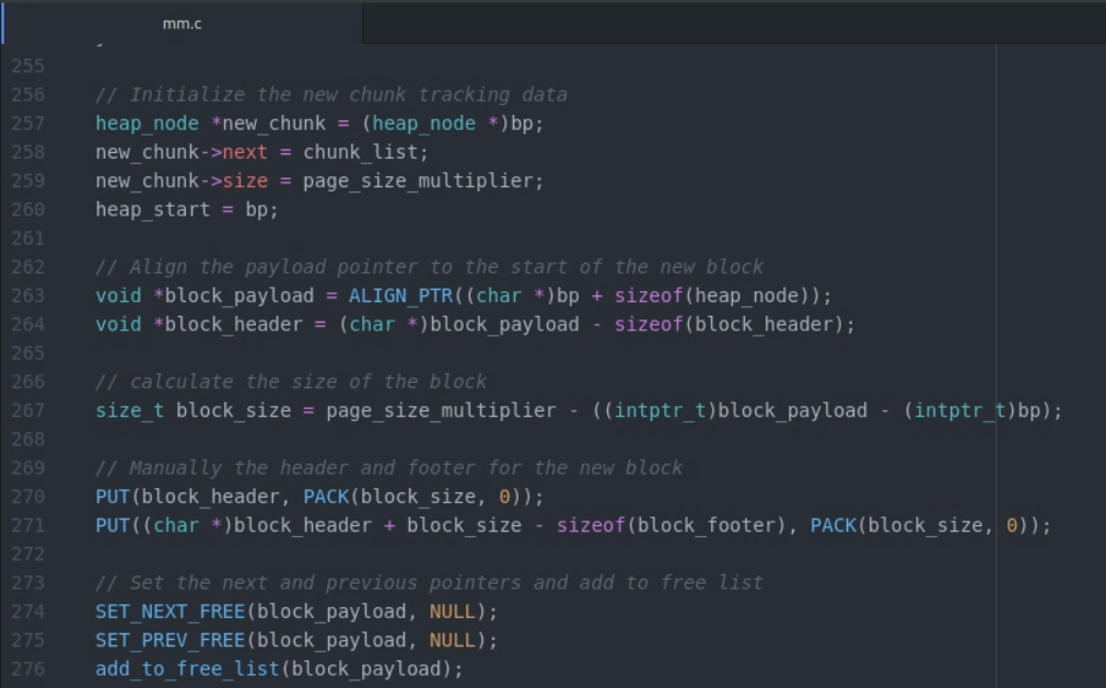 Developed a high-performance dynamic memory allocator in C, emphasizing space efficiency and throughput. Implemented 16-byte aligned block management, an explicit free list for fast allocation, and on-demand unmapping of unused pages. Ensured reliability with a custom heap consistency checker. Demonstrates low-level systems knowledge and optimization skills.